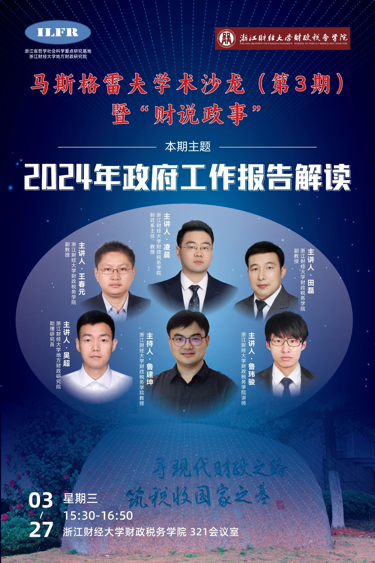 3月27日,由地方财政研究院主办、博彩导航 协办的“马斯格雷夫学术沙龙(第3期)暨“财说政事”即将来临,会议将由博彩导航 鲁建坤教授主持,主讲嘉宾为博彩导航 财政系主任凌晨教授、田磊副教授、王春元副教授、鲁玮骏老师和地方财政研究院助理研究员吴超老师。本期主题为:2024年政府工作报告解读,欢迎各位老师和同学们的加入!