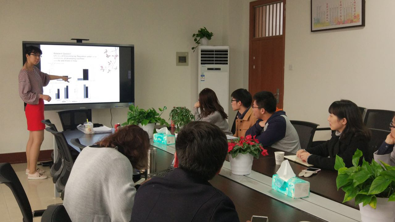 会上,倪霓老师介绍了《环境规制、空气及水污染与印度婴儿死亡率》一文,利用有史以来最全面的关于空气和水污染及环境条例汇编的发展中国家数据集,用差异设计评估了印度的环境法规,并分析得出结论,对空气质量的更高要求促使有效执行空气污染条例,表明强有力的公共支持允许环境条例在薄弱的体制环境下取得成功。