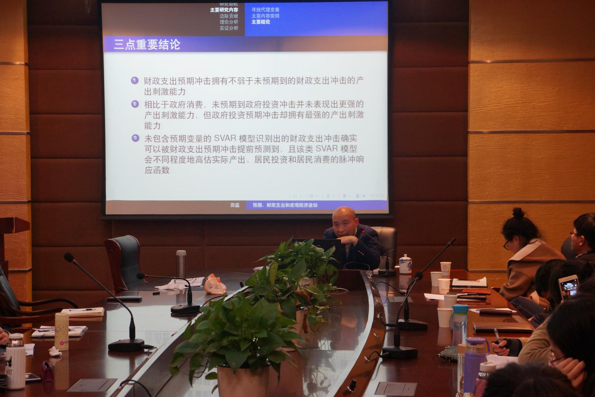 田磊老师围绕“预期、财政支出和宏观经济波动”这个课题,向我们完整地介绍了这篇文章的研究动机、主要研究内容、边际贡献、理论分析、实证分析以及主要结论等内容。通过田磊老师详细的讲解,我们了解了财政支出预期冲击拥有不弱于未预期到的财政支出冲击的产出刺激能力,以及相比于政府消费,未预期到政府投资冲击并未表现出更强的产出刺激能力,但政府投资预期冲击却拥有最强的产出刺激能力。在田磊老师做完报告后,老师和同学们都积极发言,与田磊老师就报告内容展开了激烈的讨论。