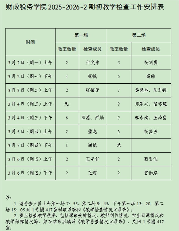 工作安排,检查期间每日分上午、下午四场次进行,每场次安排1-2名检查成员,分赴不同教室开展巡查,确保覆盖全部教学时段和课程门次。