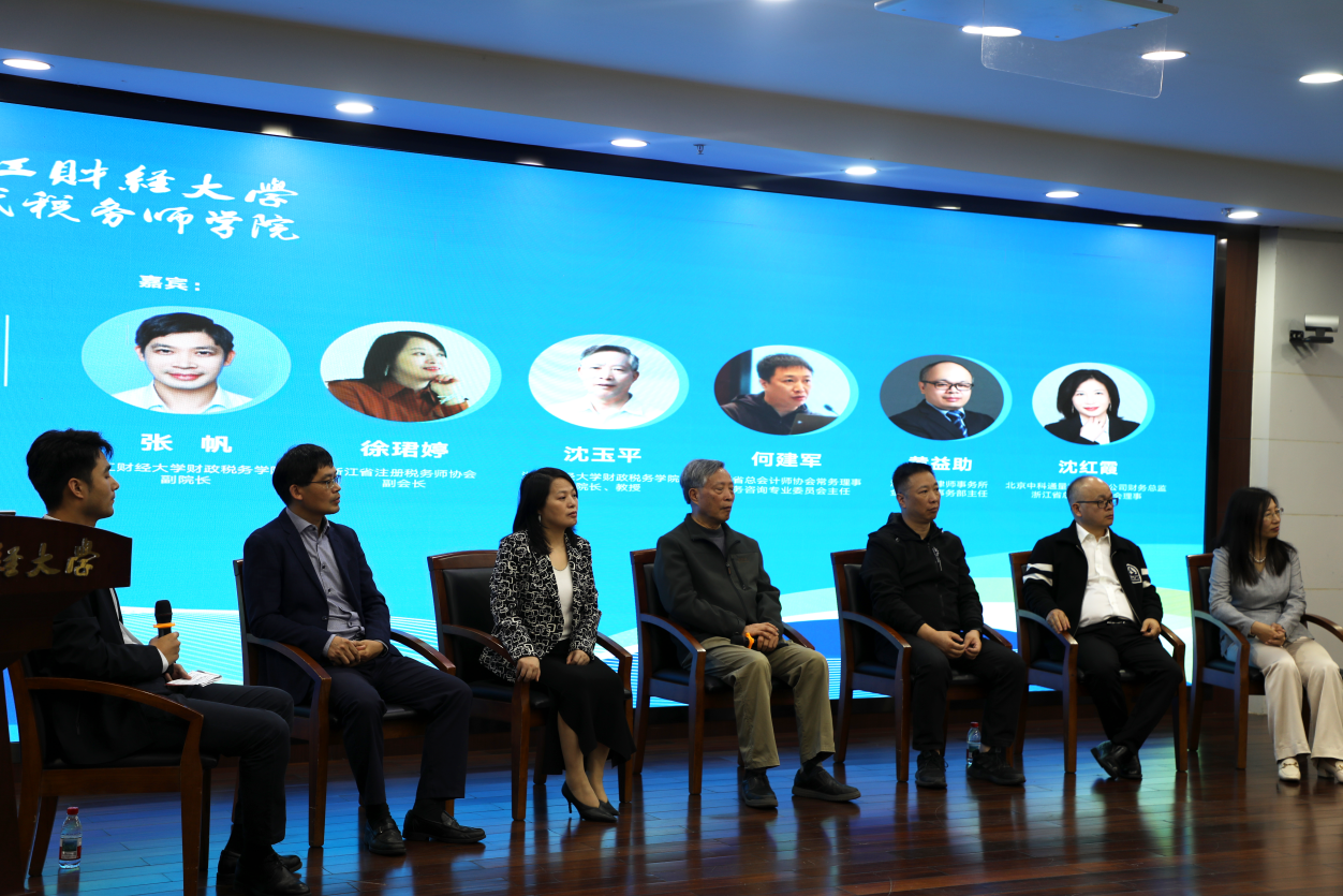 原院长沈玉平教授,浙江省注册税务师协会副会长徐珺婷,浙江省总会计师协会常务理事、税务咨询专业委员会主任何建军,浙江六善律师事务所金融财税事务部主任黄益助,浙江省总会计师协会理事沈红霞,博彩导航