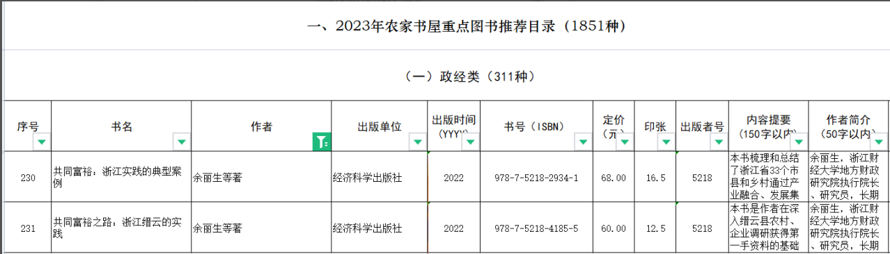 地方财政研究院执行院长余丽生研究员团队完成的《共同富裕:浙江实践的典型案例》《共同富裕之路:浙江缙云的实践》两本著作入选国家新闻出版署《2023年农家书屋重点出版物推荐目录》。《推荐目录》旨在重点配备一批科学阐释习近平新时代中国特色社会主义思想和党的二十大精神、深刻阐明“两个确立”的决定性意义、深入介绍新时代10年的伟大变革特别是全面建成小康社会的历史性成就、全面推进乡村振兴战略实施等方面的重点主题出版物,着力发挥优秀出版物的引领作用,推动学思想、用思想,为广大农民群众奋进新征程、建功新时代提供强大精神力量。