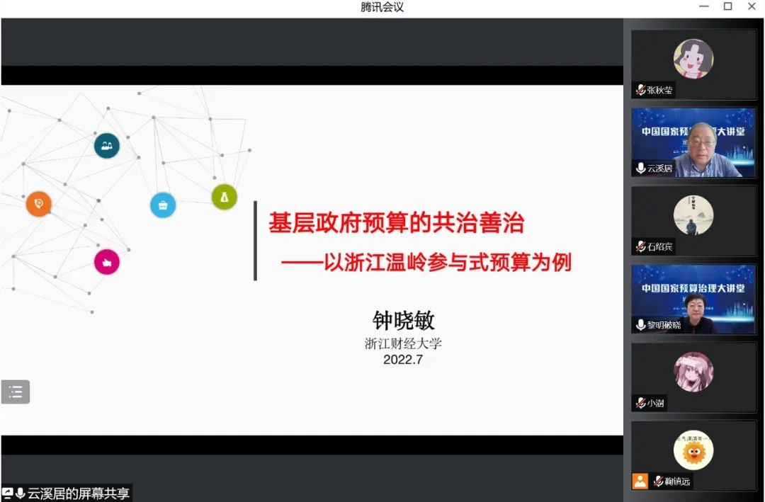 “中国国家预算治理大讲堂”由中国国家预算治理研究联盟主办,是面向国家预算治理研究领域学术界、实务界的持续性学术交流品牌活动,也是作为学术共同体的联盟推动国家预算治理领域的学者交流、学术研究、资源共享、资政育人、服务国家预算治理现代化的一个重要举措。本期大讲堂以线上方式举行,来自全国高校、科研院所、预算管理实务的300余位专家学者和学子参加本期大讲堂。