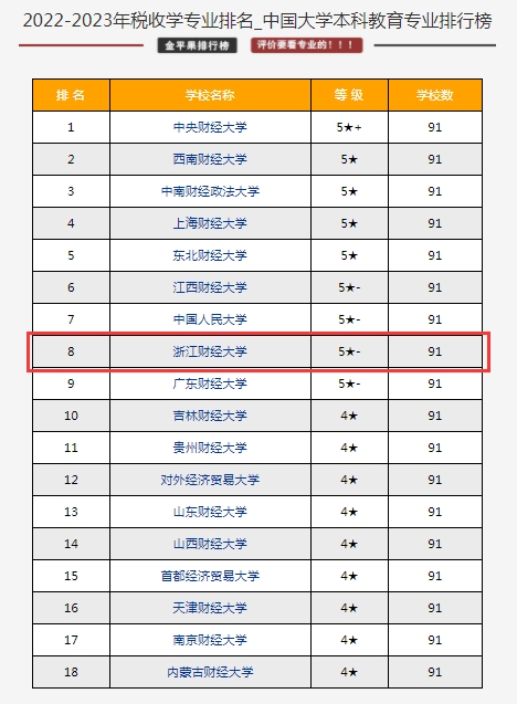 财政学类在全国130所开设高校中排名第8位,财政学专业在全国84所开设院校中排名第8位,税收学专业在91所开设的院校中排名第8位。财政学、税收学两个专业的排名连续多年跻身全国前10。