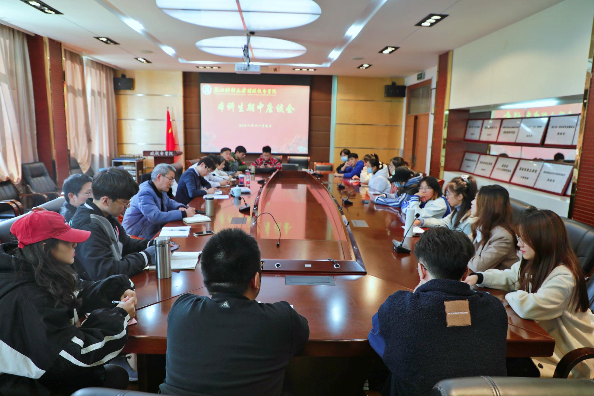 楼307会议室召开了本科生期中教学座谈会,本次会议由教学副院长童光辉主持。院党委副书记徐丽玲,财政系主任凌晨,税务系副主任黄冠豪,院本科教学督导组骆勤、王序坤、曹爱民,教学办主任杨老师、教学秘书方梦澜出席,全体教学信息员参加会议。