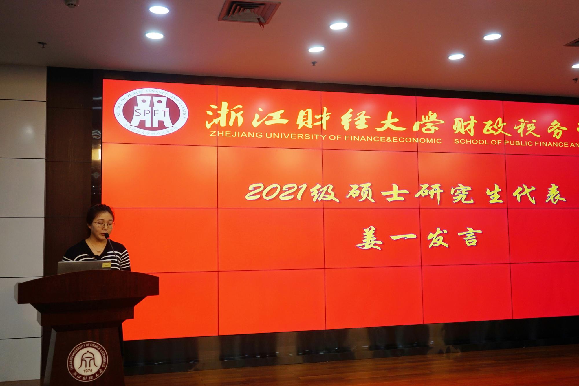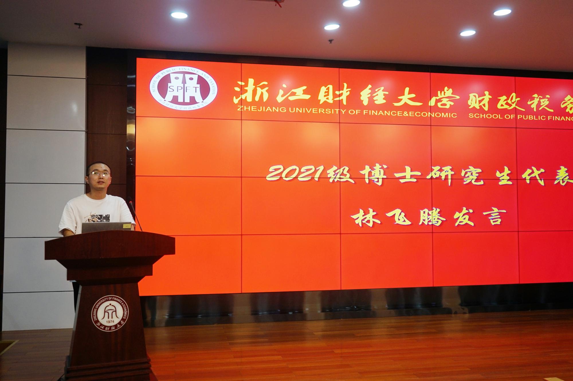 博士研究生林飞腾和硕士研究生姜一代表新生发表了入学感言。他们表示,在新的起点上,将尽快转换身份,树立明确目标,聆听导师教诲,践行进德修业、与时偕行的浙财精神,学有所用,学有所长。