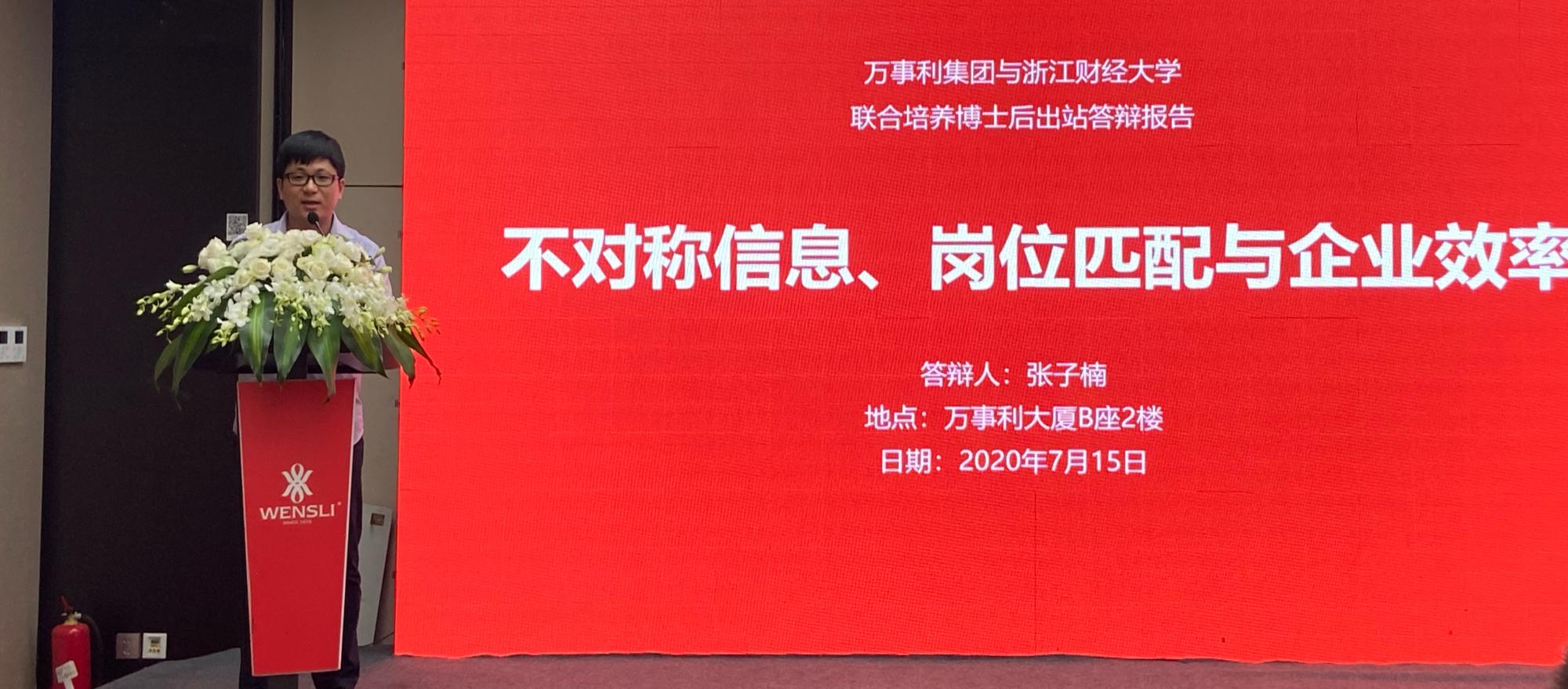 与万事利集团联合培养的首个博士后张子楠经过出站答辩评审会,以优秀评级顺利出站。中共浙江省委组织部人才办副主任、省人力社保厅二级巡视员陈荣华,浙江省人力社保厅专技处二级调研员朱淑梅等相关领导,校长钟晓敏、万事利丝绸文化股份董事长李建华等博士后合作导师以及副校长李永友、财通证券党委副书记胡国华、浙江大学公共经济与财政研究所所长郑备军等考评组专家参加评审会。