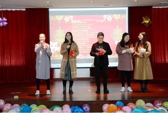 联欢会伊始,财政系张朝阳、童幼雏、刘丹老师带来一组歌曲串烧,欢快的歌声瞬间点燃气氛;刘初旺老师的《十送同事过新年》、鲁建坤老师的《从头再来》赢得阵阵掌声。《击鼓传花》、《不是你以为的萝卜蹲》、《你比划我来猜》等小游戏穿插其中,将节日的气氛一次又一次推向高潮。短暂的游戏过后,由行政办公室五位老师带来多种语言的歌曲串烧,展示了博彩导航