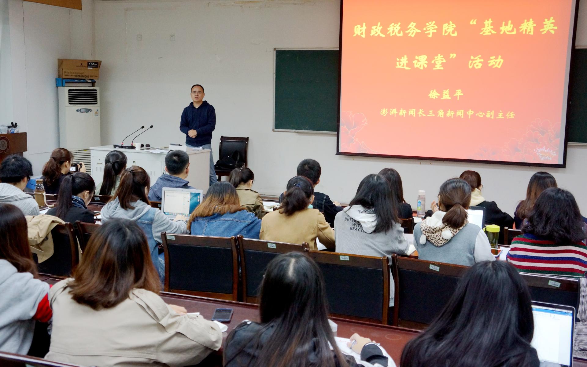 楼106教室为14、15级财经新闻的同学做“财经新闻基地精英进课堂”系列讲座。讲座由《财经新闻报道》任课老师季陈翔主持,由主讲嘉宾徐益平老师以澎湃新闻三个成功的专题报道为例向学生们分享了澎湃是如何做大型深度报道的,现场反响热烈,互动不断。