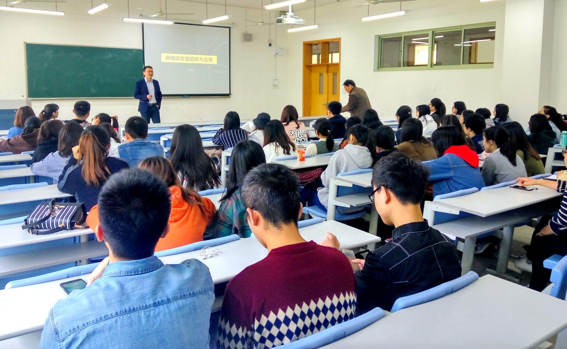 楼102教室作题为“新媒体发展趋势与应用”的专题讲座,传授有关新媒体发展与运用方面的知识。