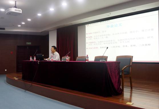首先,司言武副院长就毕业论文的相关事宜做了专业详细的说明。他从毕业论文的流程、选题、开题报告和答辩四个方面展开介绍,建议同学们选题与专业密切相关,角度要小,做到“小题大做”,并且以历年学生的选题举例说明,列举了许多参考文献,使在座同学对选题更为明确。司老师还就毕业实习提出具体要求与建议,主张同学们去专业相关的单位实习,而且实习内容应该为本专业所学习的知识技能。