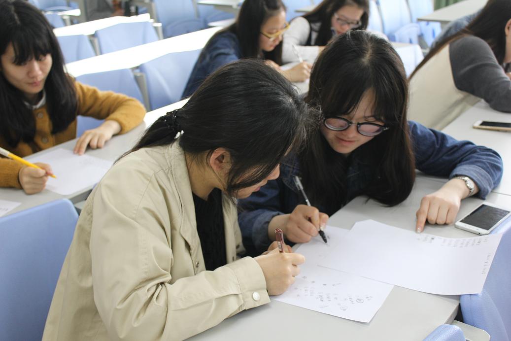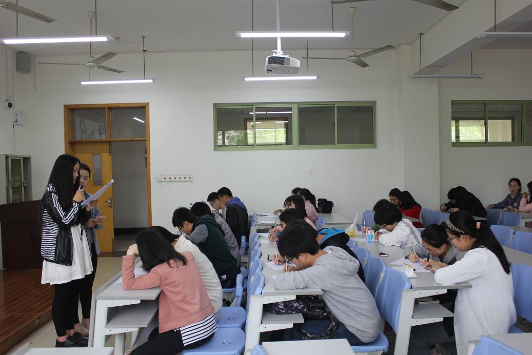 下午三点,30组参赛选手已在102教室候场,根据先到先比的原则多组进行比赛。本次汉字听写大赛采取的是现场听写、现场书写的模式,两人一组,每轮六组,由代表抽取听写题目,共十五题。听写内容以生活中的易错字为主,为了拉开参赛选手之间的差距,主办方选取了部分生僻字,这为比赛增色不少。在比赛中,当工作人员宣读词语及其释义后,参赛选手或沉着落笔,或冥思苦想。不少候场选手也用手在桌子上比划着字形,用手机查着生疏的词语。选手们“沙沙沙”的书写声、苦思无果的叹气声更是为比赛增添了紧张的气氛。经过一个多小时的角逐,30组参赛选手都听写完毕,其中有六组选手脱颖而出,成功进入决赛。