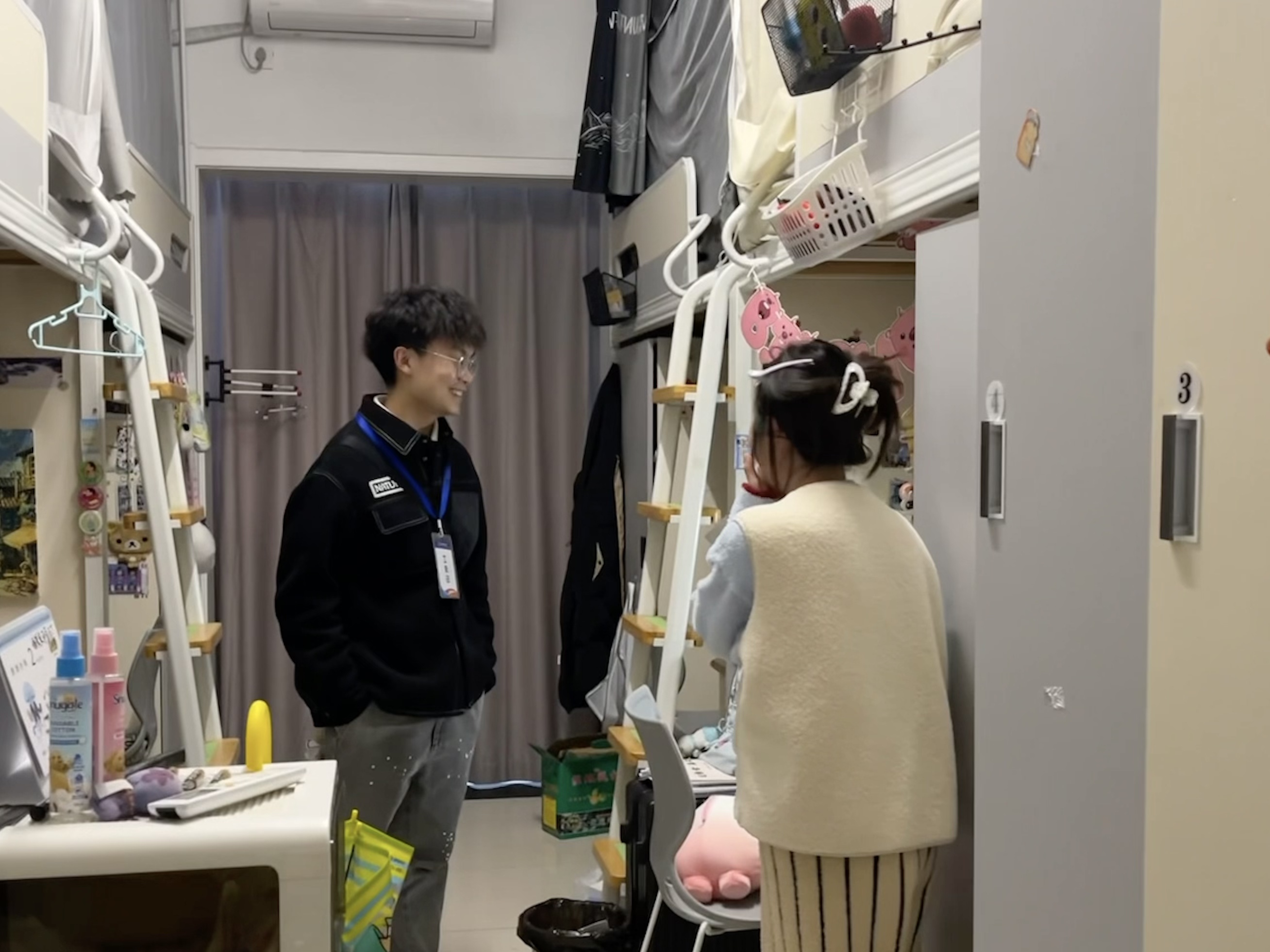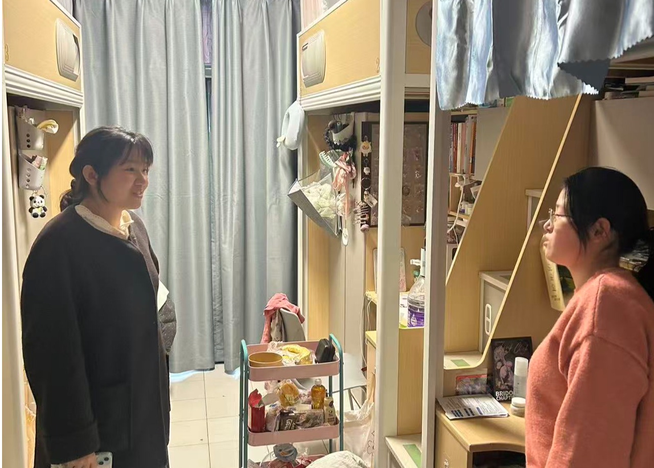 组建由辅导员及学生骨干组成的走访小组,深入寝室“面对面”走访排查,把服务与温暖送到学生身边。走访中,重点排查寝室卫生、消防、用电、网络等安全隐患;结合开学反诈高发特点,现场宣讲反诈知识、分享典型案例,引导寝室长当好“反诈宣传员”,守牢寝室安全第一道防线。