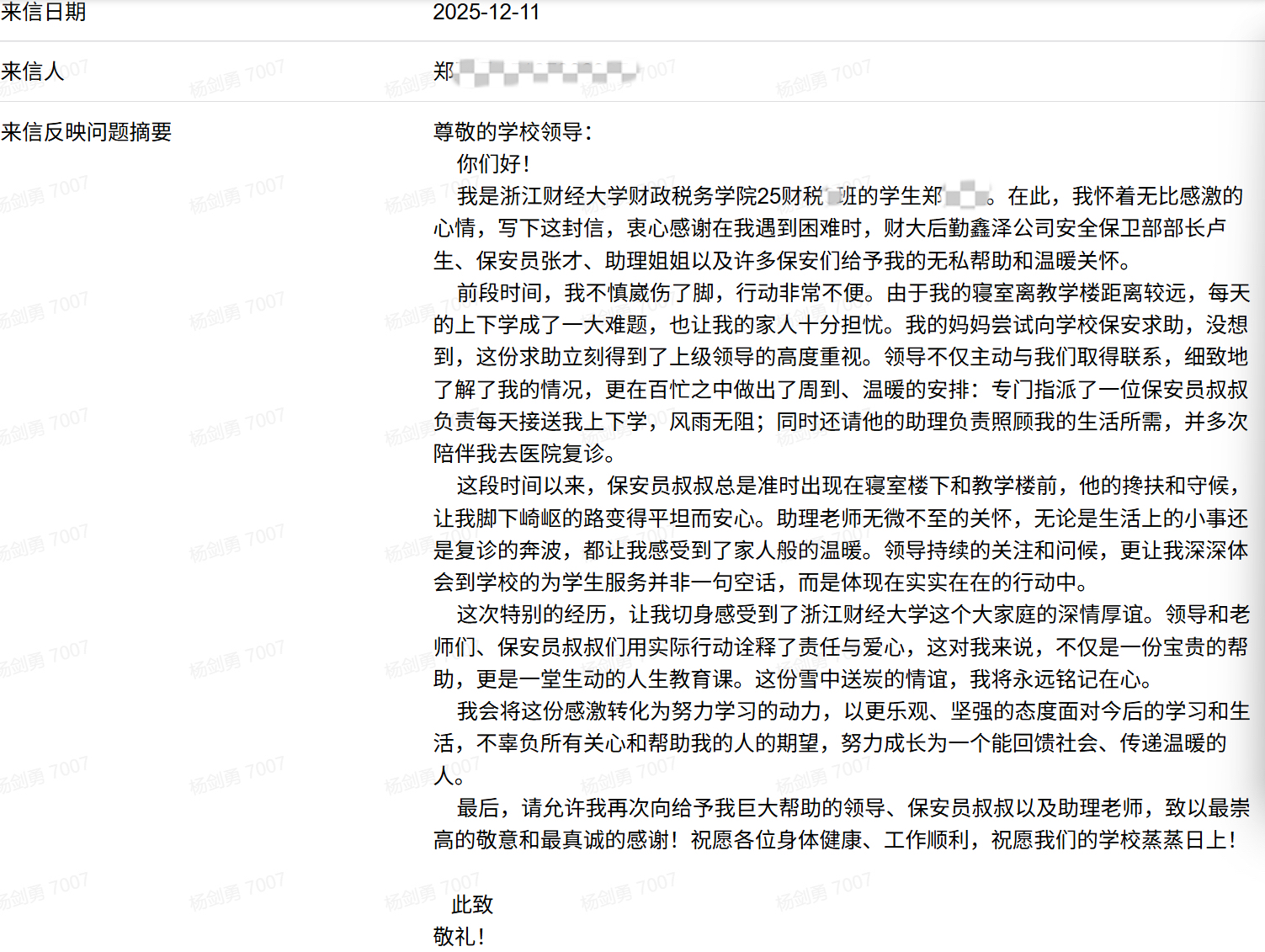 信中,郑同学讲述了因脚伤行动不便向校园安保人员求助后,迅速得到博彩导航 后勤和园区鑫泽公司的重视与响应。公司不仅安排安保人员和行政助理定时接送其上下课,还主动照顾其生活所需。这份无声细致的关爱,让郑同学在康复过程中倍感温暖,于是致信“校长信箱”表达谢意。