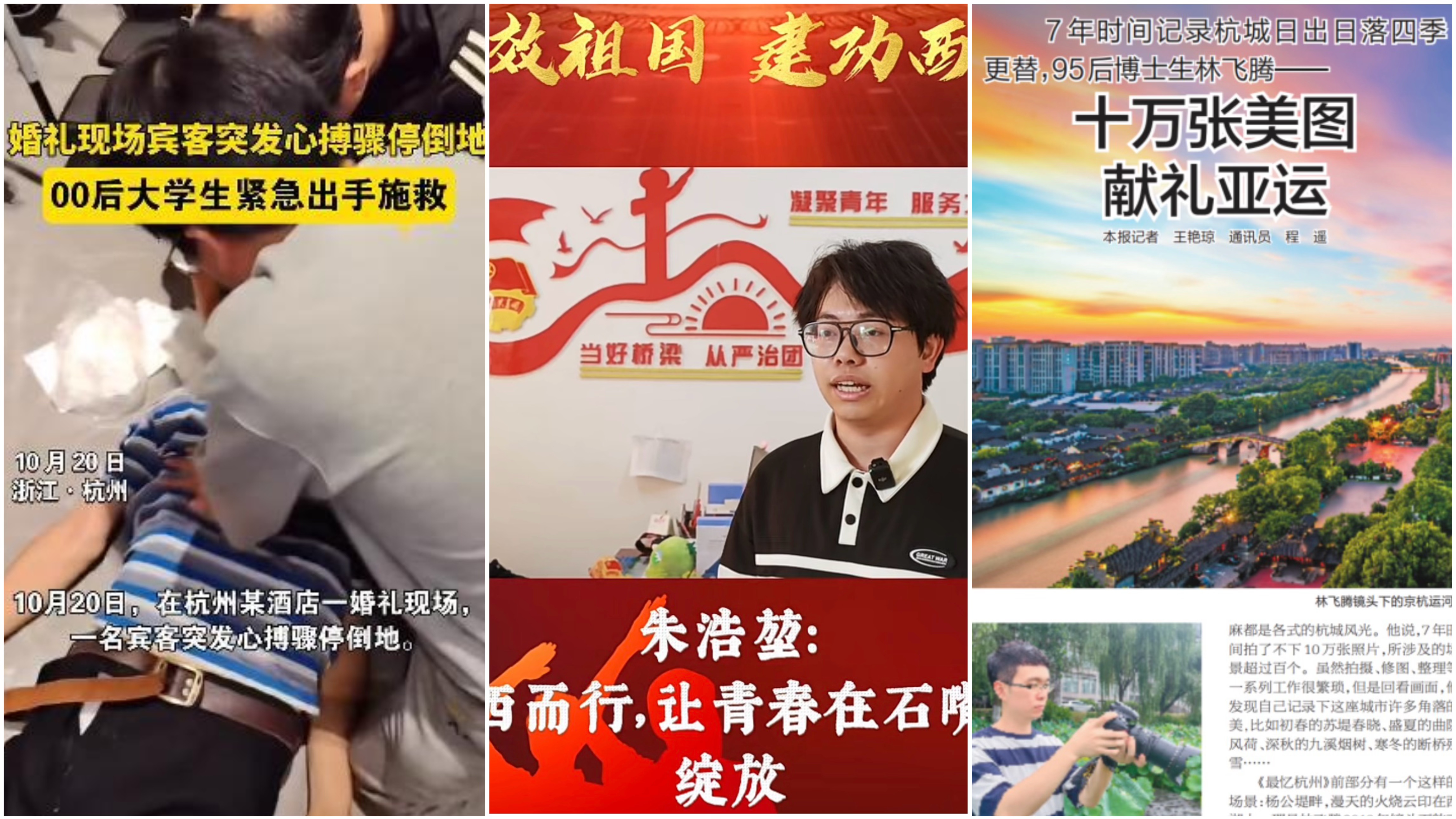 从税收学专业2019级学生朱浩堃坚定选择做一名“西部计划志愿者”,将报效祖国的誓言写在宁夏石嘴山的大地;到财政学专业2021级博士生林飞腾历时七年、用十万张影像凝结成《最忆杭州》,献礼杭州第19届亚运会;再到数智财政2023级学生郑迅在婚礼现场临危不乱、用专业急救技能挽救生命——财税学子正将成长路上收获的关爱,转化为反哺社会、担当尽责的内生动力。