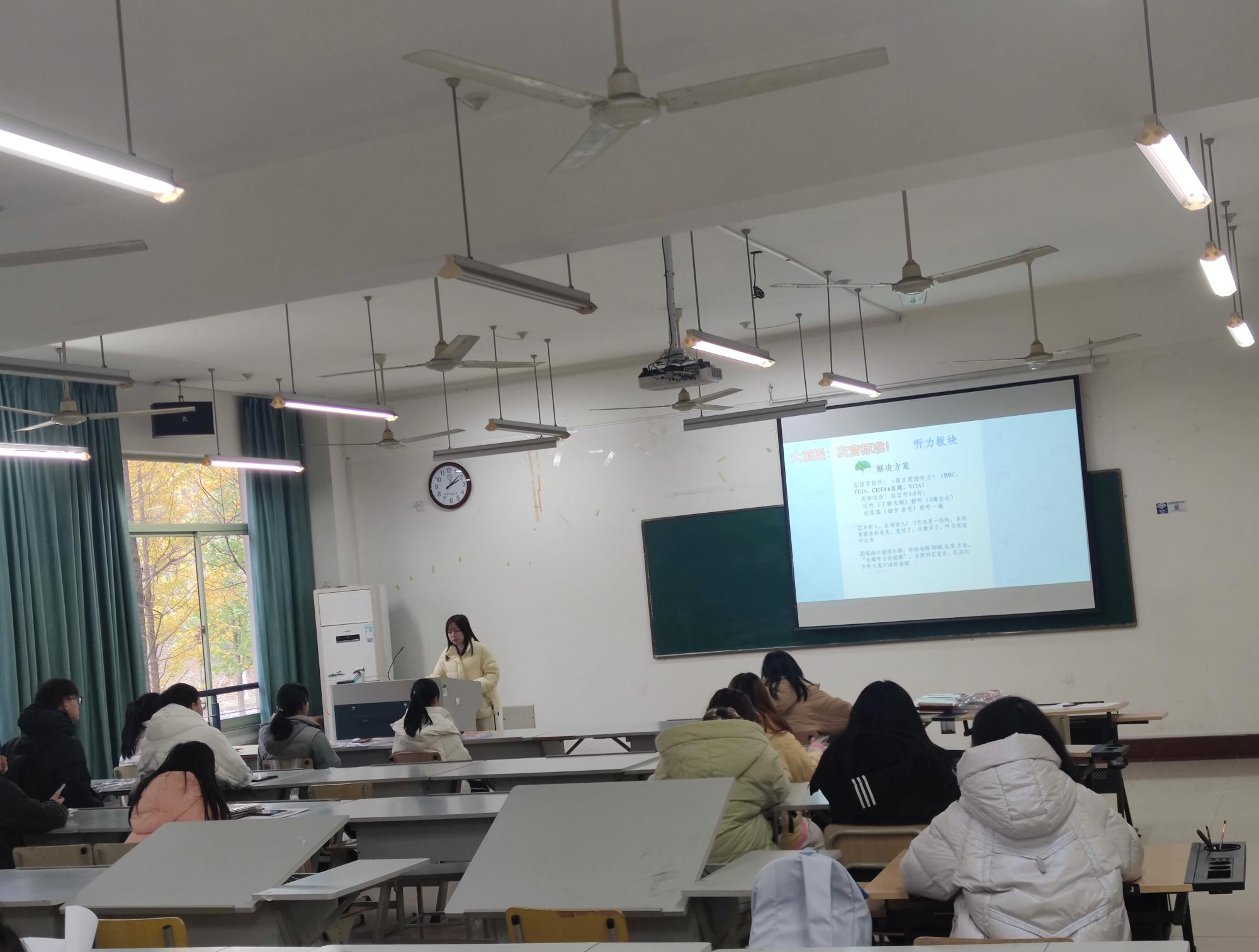 楼104举行了红鹄益站之大学英语四级培训活动。2020级吴锦婷作为此次活动主讲人向大家分享英语技能提升相关经验。