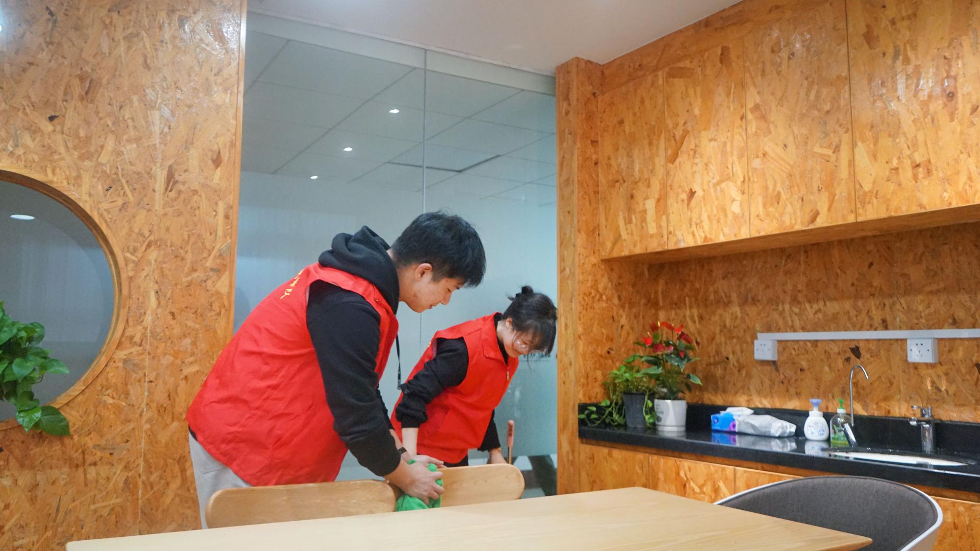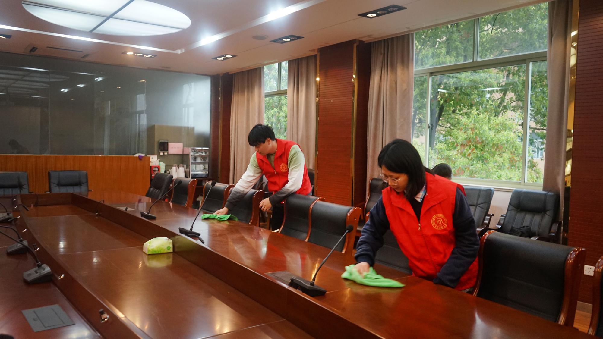 楼各教室开展新党员志愿服务活动。新党员们分工协作,耐心擦拭门窗、桌椅与储物柜,仔细地清扫灰尘,用自己的行动使党员形象体现在微小行动上,让青年党员的服务奉献精神和先锋模范精神在劳动中发光发热。