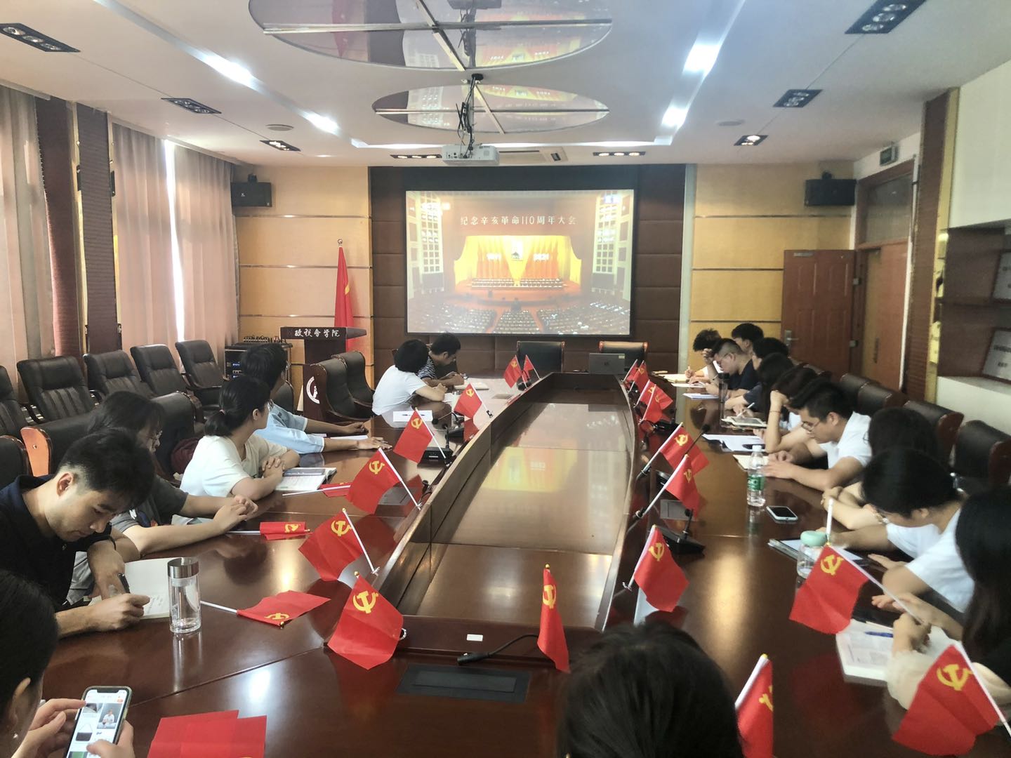 党委书记童玉玲、副书记徐丽玲和师生代表一起在线下组织观看了纪念辛亥革命110周年大会直播。