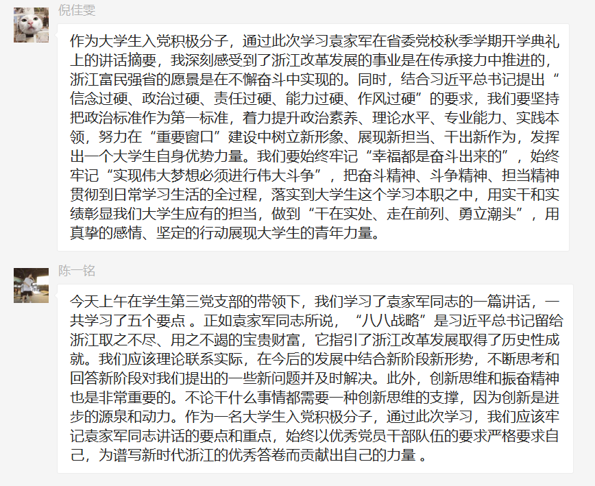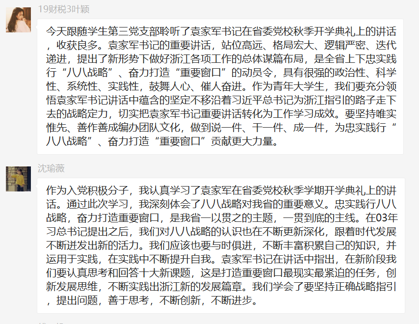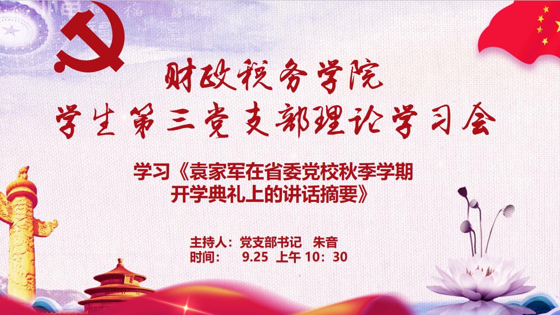 学生第三党支部组织支部全体党员及入党积极分子线上学习省委书记袁家军在省委党校秋季学期开学典礼的讲话精神。会议由学生第三党支部书记朱音主持。
