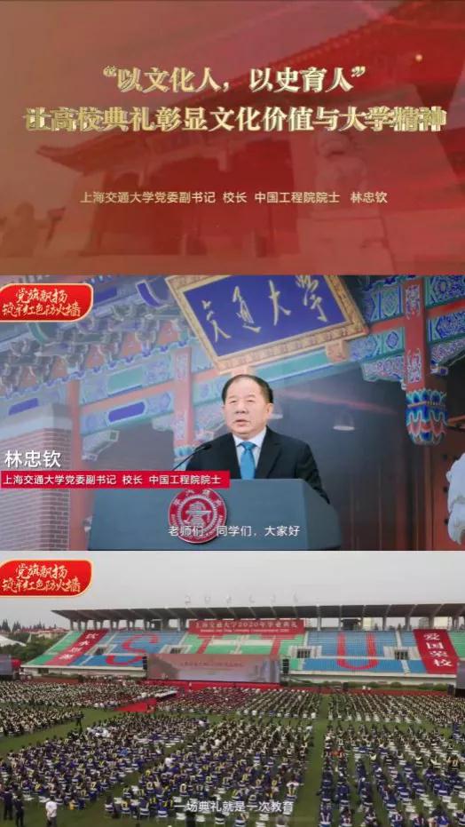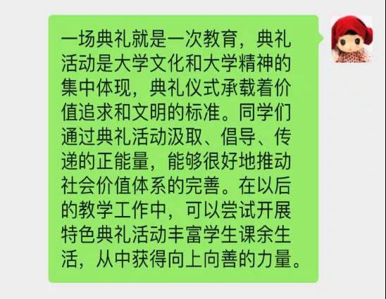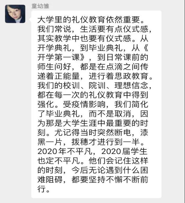 的育人温度。越是艰难的时刻,越是不能放弃仪式教育,应充分发挥典礼育人功能,引导学生增强文化自信,厚植爱国主义情怀,发挥青年人的担当与使命。”