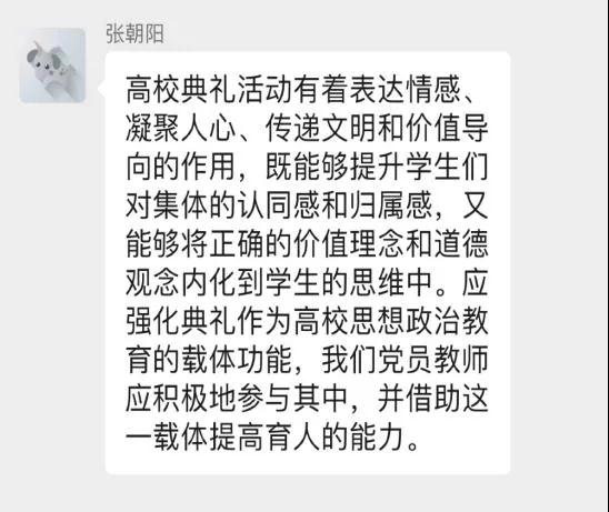 张朝阳同志说:“高校典礼活动有着表达情感、凝聚人心、传递文明和价值导向的作用,既能够提升学生们对集体的认同感和归属感,又能够将正确的价值理念和道德观念内化到学生的思维中。应强化典礼作为高校思想政治教育的载体功能,我们党员教师应积极地参与其中,并借助这一载体提高育人的能力。”