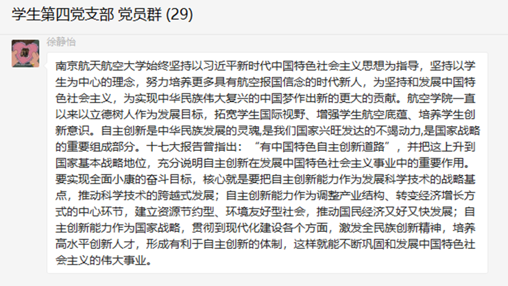 学生第四党支部组织观看学习高校党组织战“疫”示范微党课。本次微党课以“坚持正确导向,强化典礼育人”为主题,来自上海交通大学、北京理工大学、中国农业大学、南京航空航天大学的党员教师分别以“‘以文化人,以史育人’让高校典礼彰显文化价值与大学精神”、“典礼育新人,奋进新时代”、“在决胜疫情防控阻击战和脱贫攻坚战中书写青春华章”和“发挥典礼育人功能,培育‘航空报国’时代新人”为主题讲述了党员同志们在新冠疫情下积极筹办各种云端典礼,坚持做好新时代下典礼教育的价值引领与人格塑造工作,向广大学子传递了大学的文化精神与时代使命。