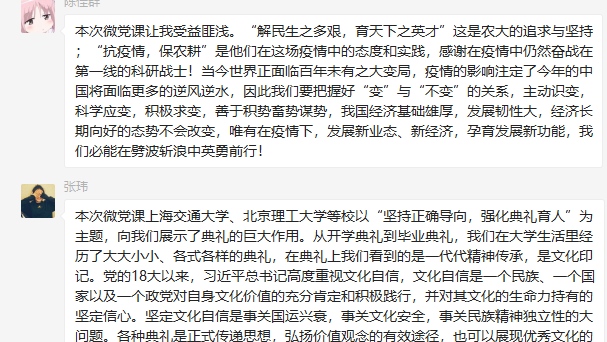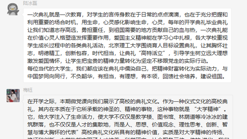 在微党课学习后,本支部学生党员也针对微党课内容展开了积极的讨论,纷纷从各自理解对“典礼育人”阐述了自己的理解。