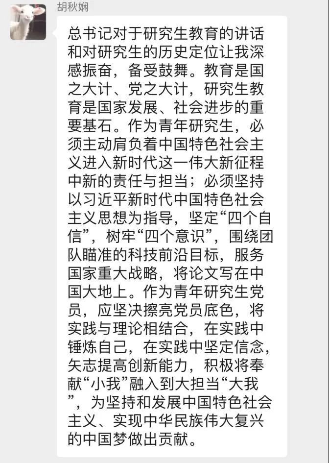 胡秋娴同志谈到:“总书记对于研究生教育的讲话和对研究生的历史定位让我深感振奋,备受鼓舞。教育是国之大计、党之大计,研究生教育是国家发展、社会进步的重要基石。作为青年研究生,必须主动肩负着中国特色社会主义进入新时代这一伟大新征程中新的责任与担当;必须坚持以习近平新时代中国特色社会主义思想为指导,坚定‘四个自信’,树牢‘四个意识’,围绕团队瞄准的科技前沿目标,服务国家重大战略,将论文写在中国大地上。作为青年研究生党员,应坚决擦亮党员底色,将实践与理论相结合,在实践中锤炼自己,在实践中坚定信念,矢志提高创新能力,积极将奉献‘小我’融入到大担当‘大我’,为坚持和发展中国特色社会主义、实现中华民族伟大复兴的中国梦做出贡献。”