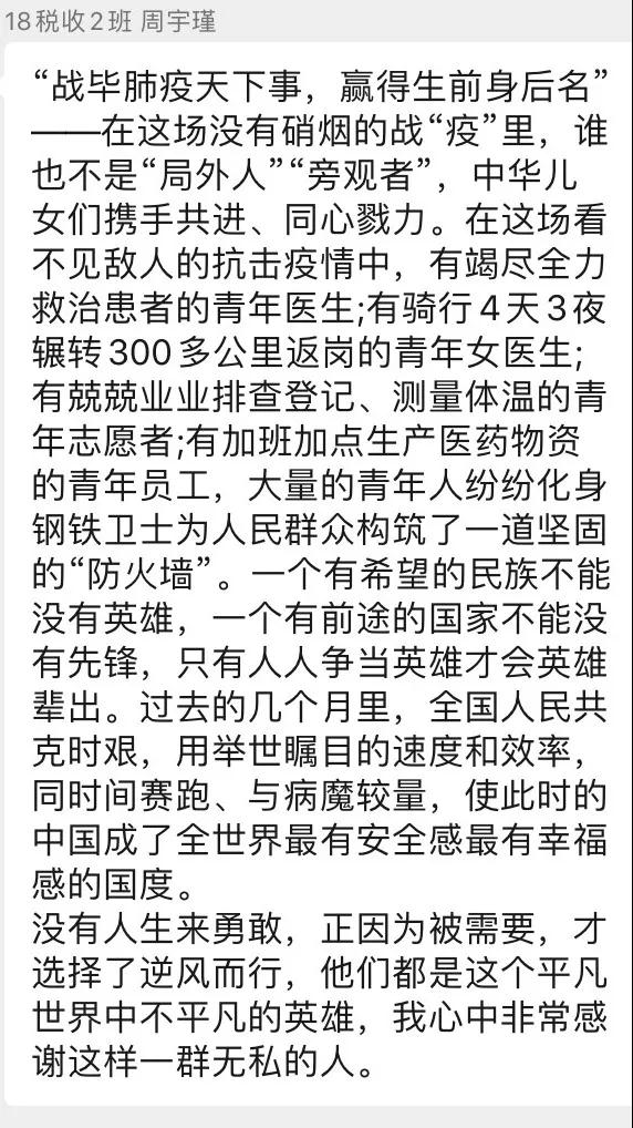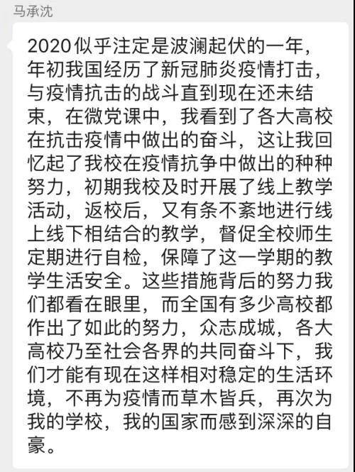 吴昕仪同志认为:“通过本次微党课学习,我了解到了疫情期间各高校都在为国家的抗疫工作做出自己的贡献,不论是输送党员同志前往抗疫一线,还是根据疫情所面临的困境进行创新研究,大学生所展现的责任感在抗疫工作中越来越突显出其重要性。同时,国家在保障民生上也可谓多管齐下,始终坚持人民至上,生命至上。具体来说,政府在医疗保障落到实处,在粮食的生产、流通、供应环节上做到提供足量的居民生活必需品。在召开十九大时,会上提出的‘六稳’‘六保’提振了市场经济各个微观主体的信心,人民群众也对美好生活有了更强的信仰。沉舟侧畔千帆过,病树前头万木春。愿每一个小我都发挥出自己最珍贵的价值,做一个自信、独立而又有担当的青年!”