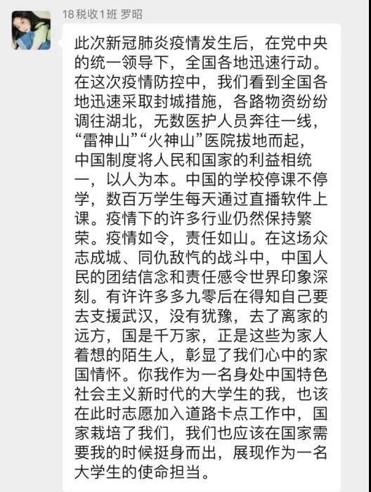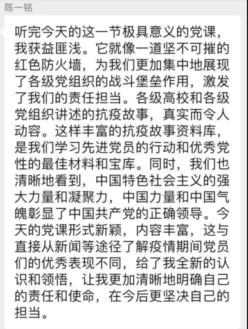朱睿珏同志说:“通过本次微党课的学习,我更加深刻地认识到共产党员的责任与担当。在任何时刻,特别是危急时刻,更要充分发挥先锋模范作用,不忘初心、牢记使命,挺身而出、英勇奋斗,做到疫情在哪里,共产党员的身影就出现在哪里。正是因为这些共产党员的无私与担当,才让全国人民在这场战役中有了‘主心骨’,吃下了‘定心丸’,坚定了打赢这场战役的必胜信念。作为一名入党积极分子,我们要不断向共产党员靠拢。在这场防控疫情斗争中,我们一定要尽力而为,团结一心、同舟共济,众志成城、共克时艰!”