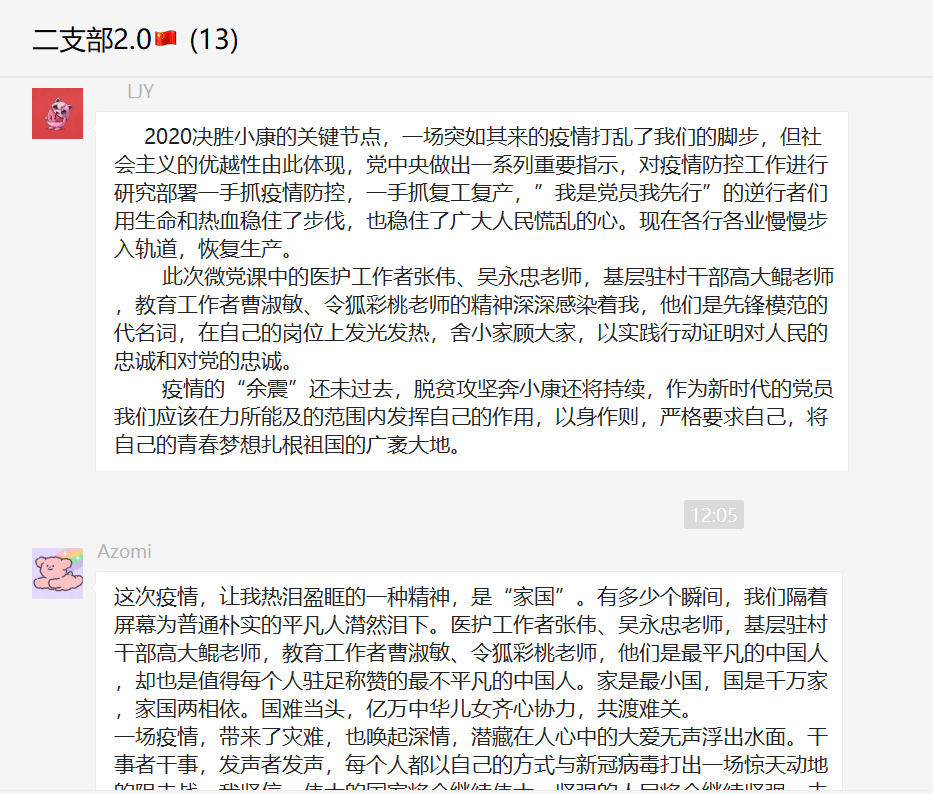 我支部同志下课后就本次学习展开了热烈的讨论。陈奕琦同志说:“我印象最深刻的便是北京航空航天大学的刘莹莹同学,她半年未出校门,在他人按下暂停键的时候,她却按下了快进键,积极抢回已经失去的时间……她积极发挥了党员自身立足现实、不断奉献的精神,发光发热,我也从她的行为中感受到了党员肩头的那一份沉甸甸的责任感与使命感,在由衷的敬佩的同时也希望勉励自己不断学习与奋斗。