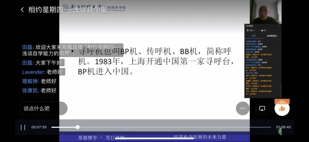 田磊老师以“浅谈大学生自学能力的培养”为主题,结合大学生自我管理、自我服务和自我学习的要求,为同学们在自学方面提供了指导,增强了学生对培养自学能力重要性的意识,提高自学效率也有了更深的理解。