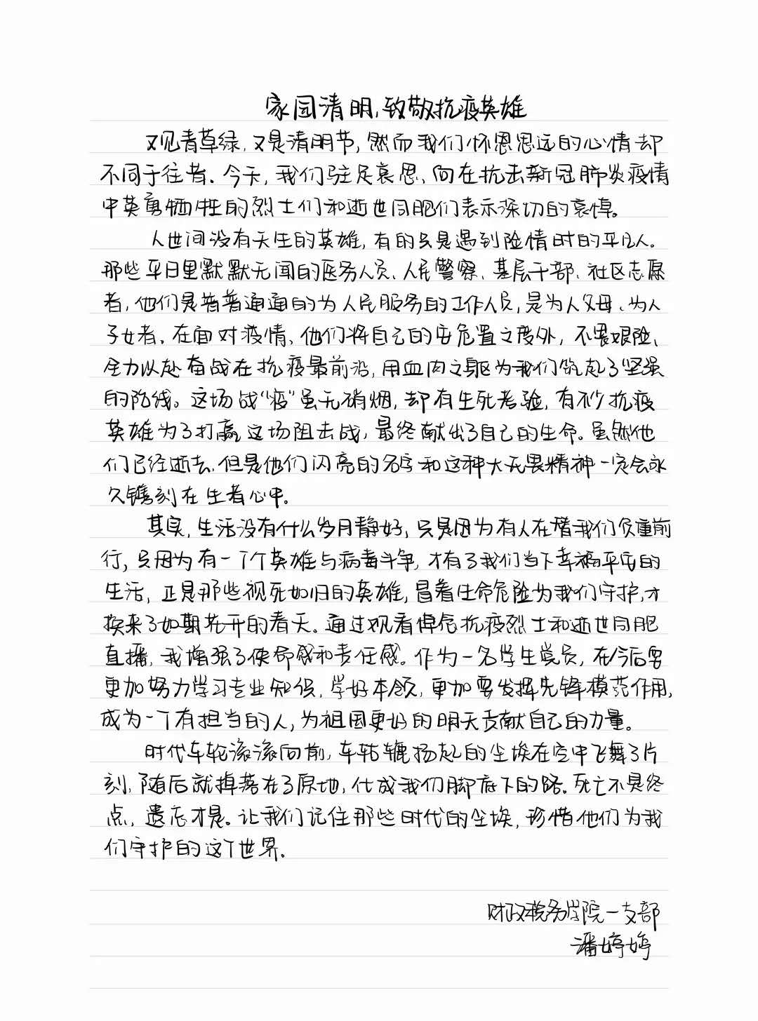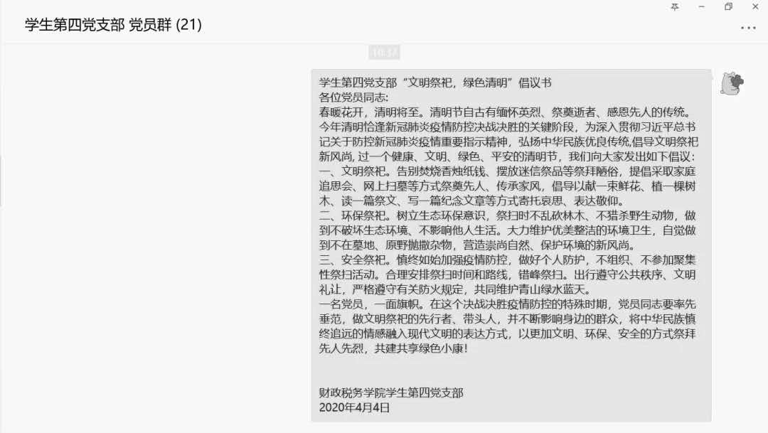 结合疫情防控工作需要,学生第四党支部发出《文明祭祀,绿色清明》倡议书,号召全体师生党员率先垂范,在清明节之际做到“文明祭祀、环保祭祀、安全祭祀”三大要求,通过网络祭奠、居家追思、鲜花代祭等方式缅怀先辈,追念故人,将中华民族慎终追远的情感融入现代文明的表达方式,切实做到疫情防控工作不松懈,树立文明祭扫新风尚。