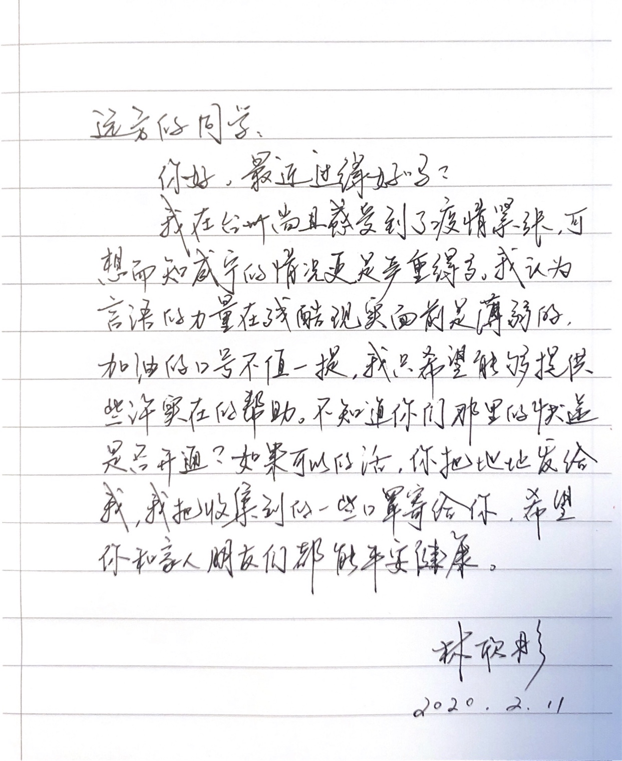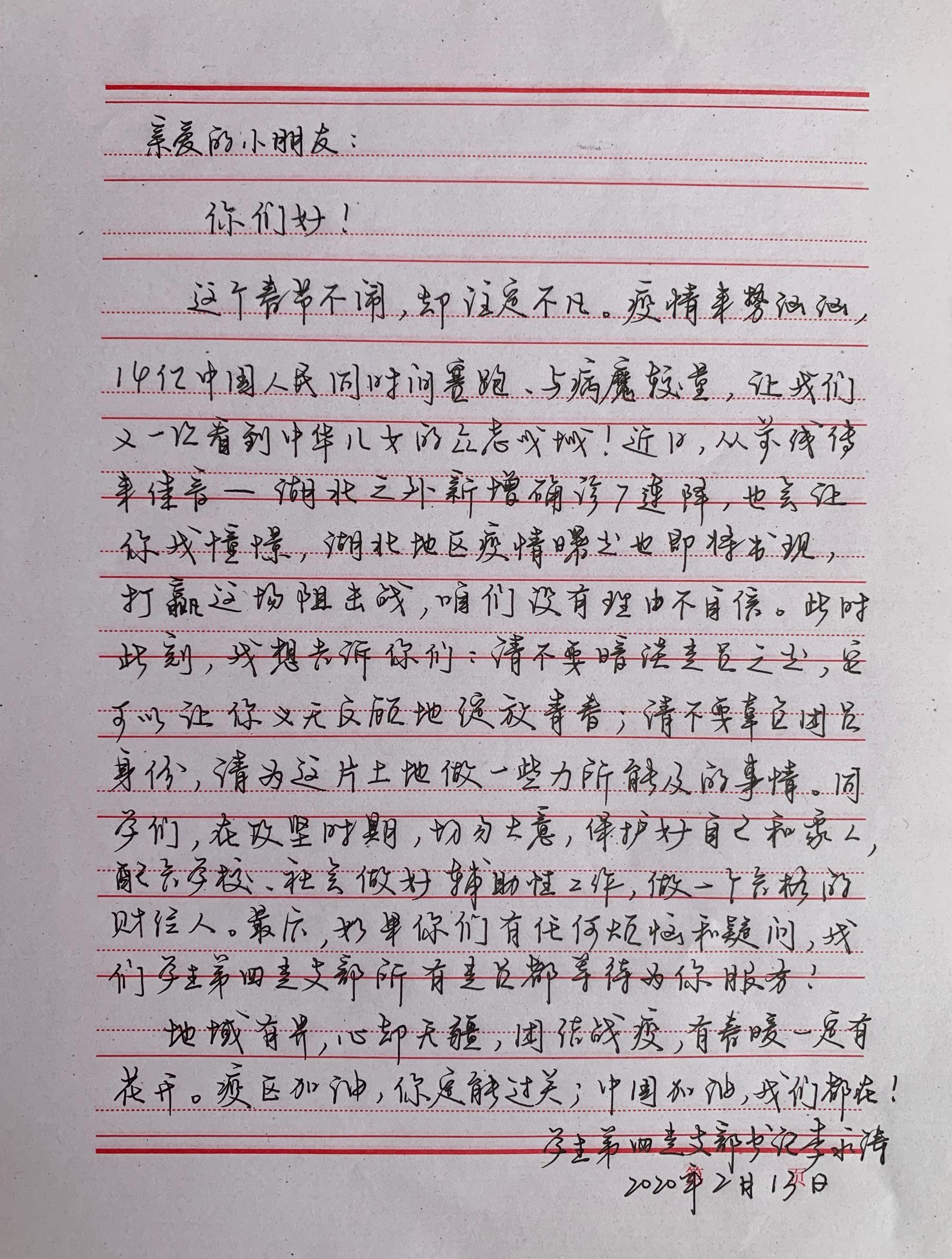 见字如晤,纸短情长。连日来,支部党员纷纷给疫区的财税学子写下一封私人信件,字里行间流露出脉脉温情。通过非疫区与疫区、重疫区之间的信件往来,党员与非党员之间相互提醒和思想共勉,帮助他人消除恐慌感,提高稳定情绪,增强信心,切实把关怀和温暖送到学生的心坎上,当好人民的贴心人和主心骨。“当收到疫区同学的回信时,我内心充满感动,等疫情过了,一定要组团去武汉看看!”金磊同志如是说。
