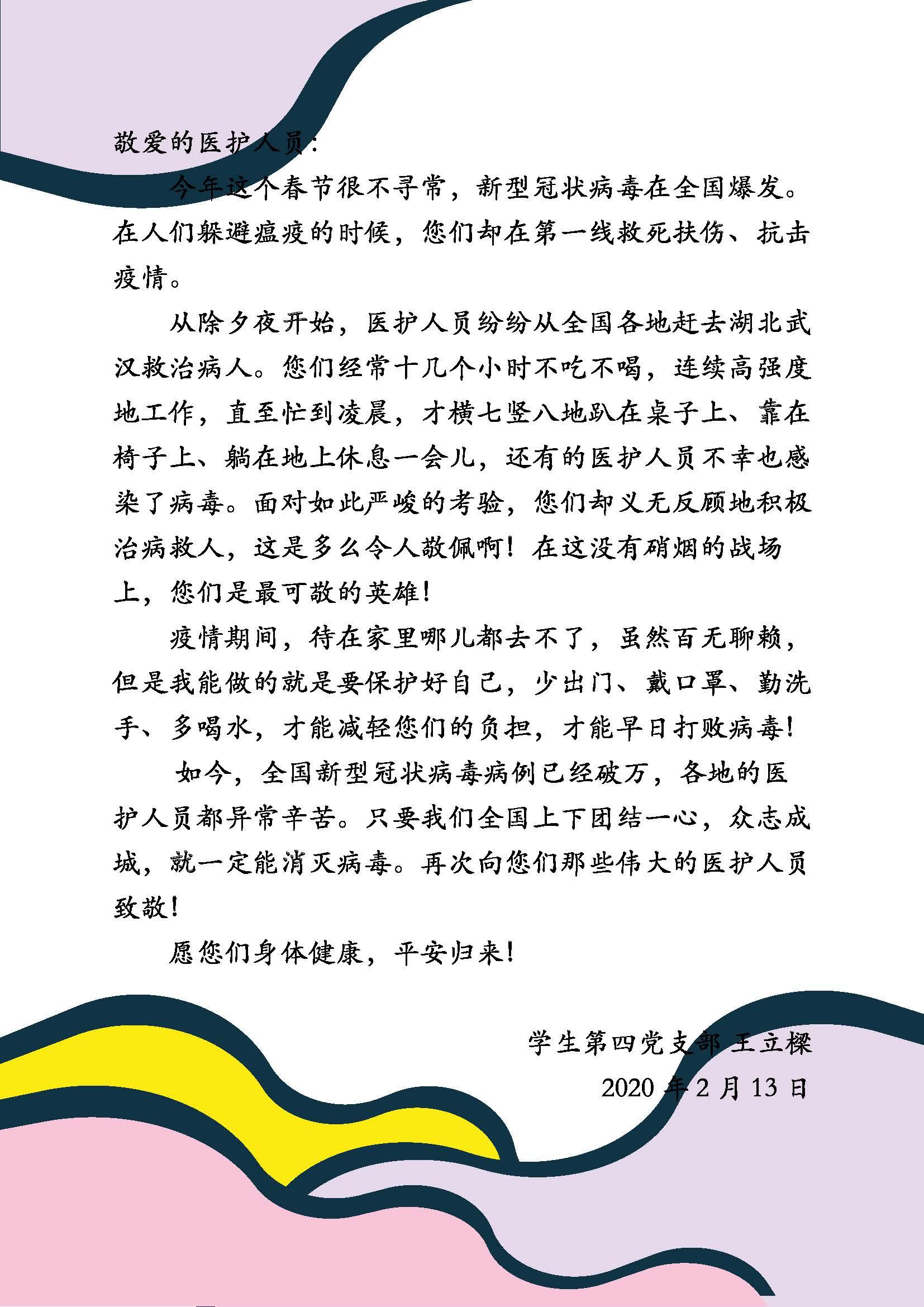 学生第四党支部充分彰显党员先锋模范作用,组织开展“抗击疫情,党员‘温’行”主题党日系列活动。活动主要包括温信、温心、温情三部分,通过疫区安全防控自助、写信回信互勉、捐款献爱心助人等内容,筑牢疫区学子思想堤坝,坚定打赢疫区战争的信心。