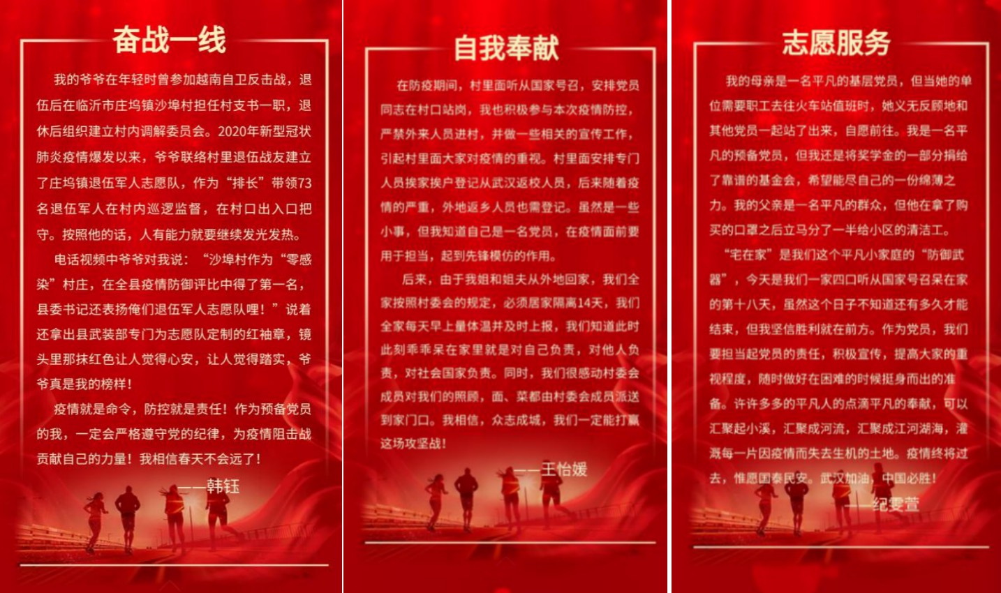 自支部推出“阻击疫情,党员先行——你我身边的防疫故事”征集活动以来,党员们纷纷主动投稿,将所历所感、所见所闻凝练成一个个生动可感的战“疫”故事。其中,支部预备党员竺星鑫的姐姐是一名医务人员,为驰援武汉剪去了多年长发,至今仍逆行在防疫一线;预备党员韩钰协助退伍军人出身的爷爷,组建退伍军人志愿队,共联络73名战友在村内巡逻监督,为村民的安全保驾护航;在物资紧缺的当下,预备党员韩青桦主动拿出家中2包“珍贵”的口罩,并带上水果,送给连续多日在小区门口值班的保安;党员王怡媛因被动接触外地归来的亲戚,主动向所在村委会报备,自觉居家隔离,并积极为乡村疫情防控做好宣传工作……