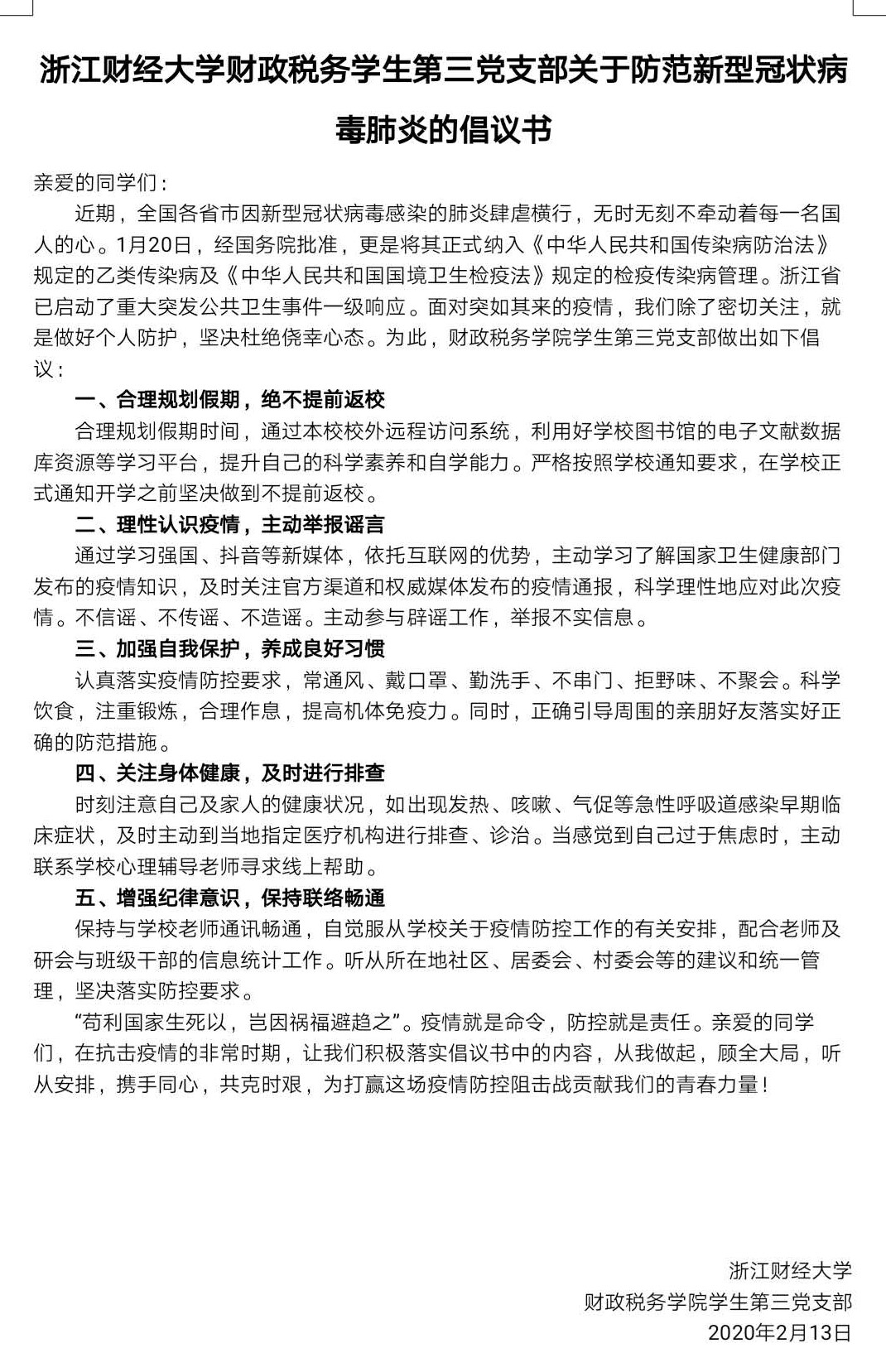 与此同时,支部党员共同书写倡议书,向全体学生发出五大倡议:一、合理规划假期,绝不提前返校;二、理性认识疫情,主动举报谣言;三、加强自我保护,养成良好习惯;四、关注身体健康,及时进行排查;五、增强纪律意识,保持联络畅通。在防控疫情的关键时刻,支部24名党员带头承诺,坚决顾全大局,服从属地政府、博彩导航