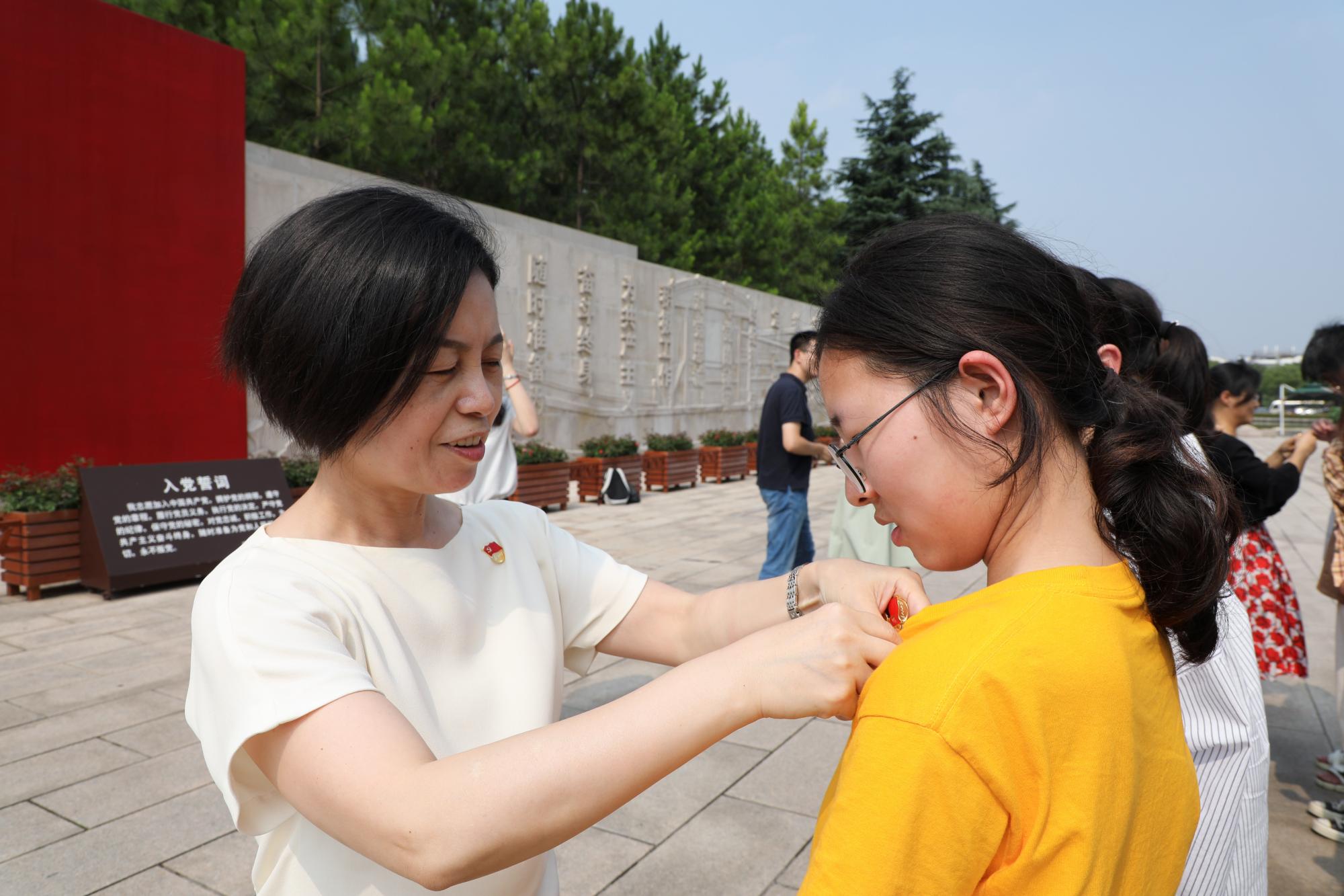 党委书记杨春玲带领全体党员庄严宣誓,重温入党誓词,并为新入党的近30名学生党员佩戴党徽,逐一分发《中国共产党章程》和《中国共产党纪律处分条例》。