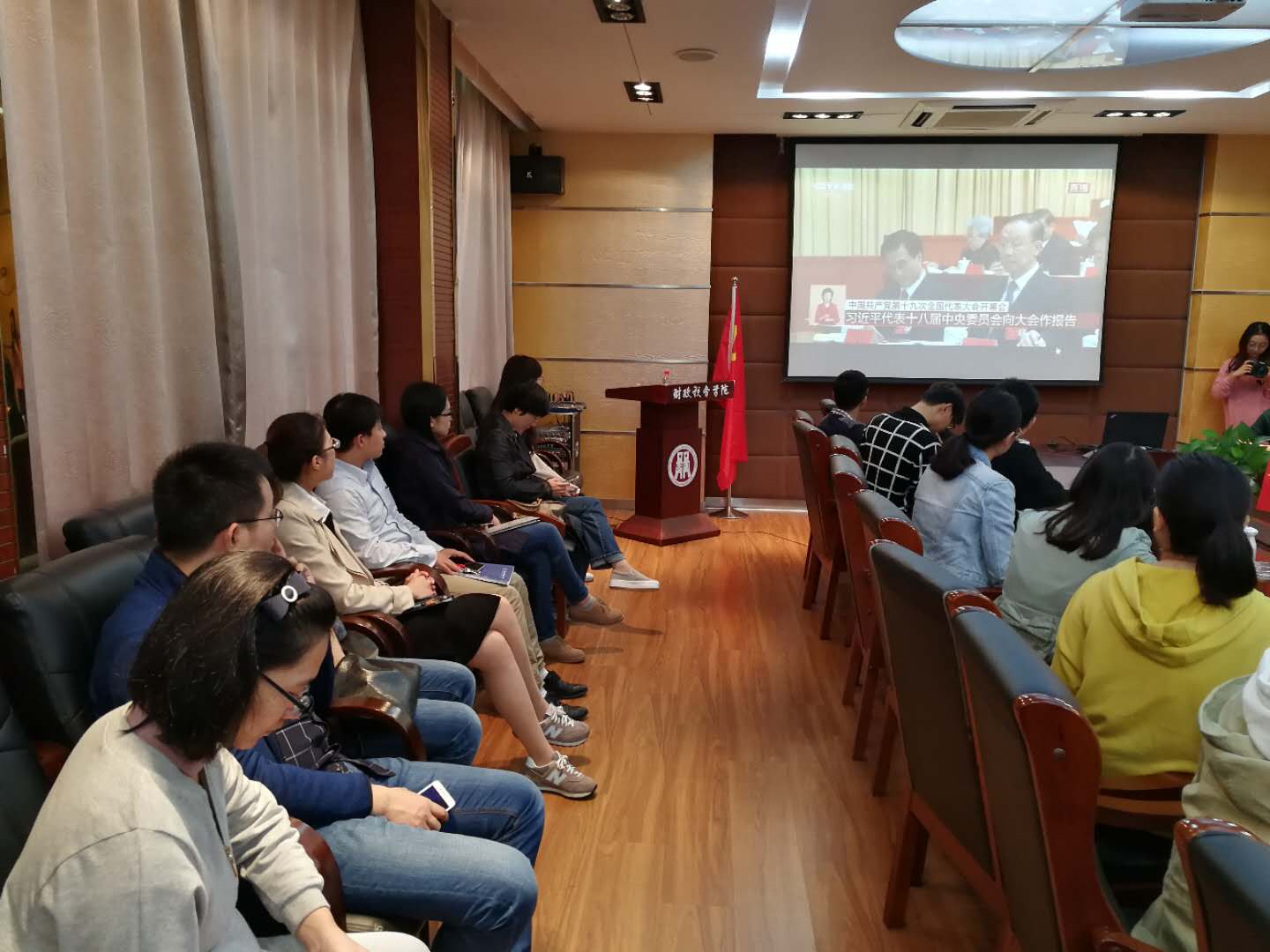 党委认真组织全院师生党员在1-307会议室,集体收听收看党的十九大开幕会直播,现场气氛庄重而热烈。