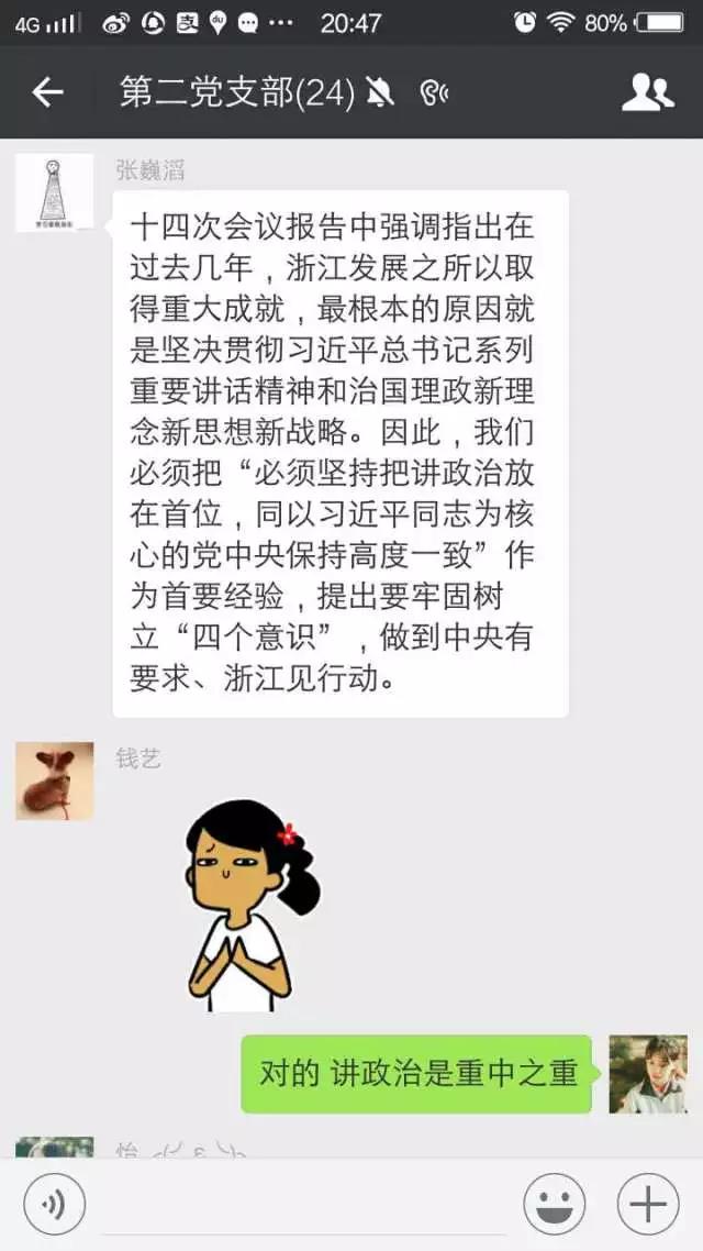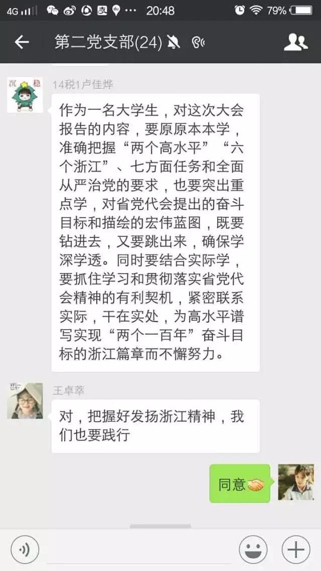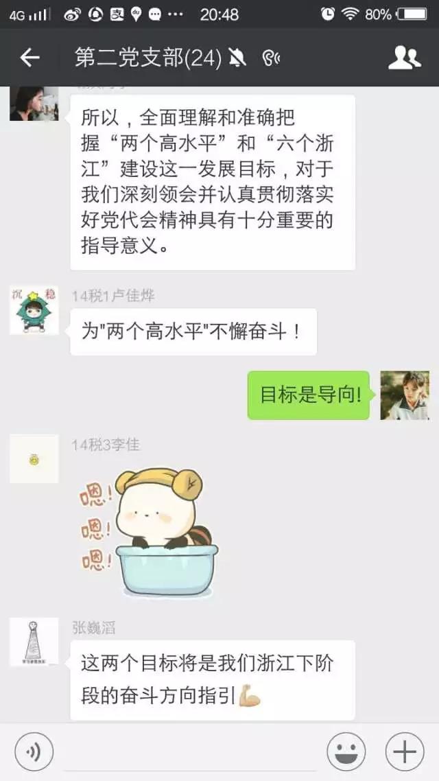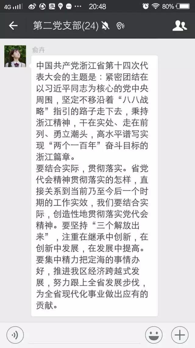 每位党员自行学习了省十四次党代会会议内容与精神,并在党员群里集中讨论了学习后的所感所悟。党员们对于“八八战略”“六个浙江”“两个高水平”“四个强省”等热词都发表了自己独特的见解。